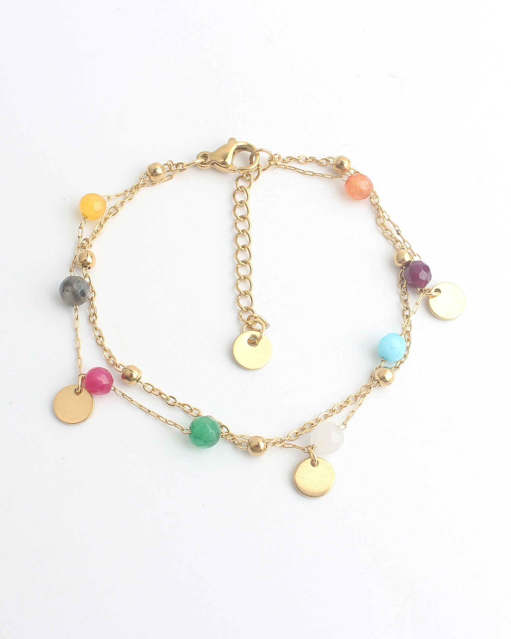 Pulsera con muchos colores y detalles dorados y con dos capas. La pulsera es de acero inoxidable, por lo que podrá ducharse, nadar y hacer ejercicio con ella.